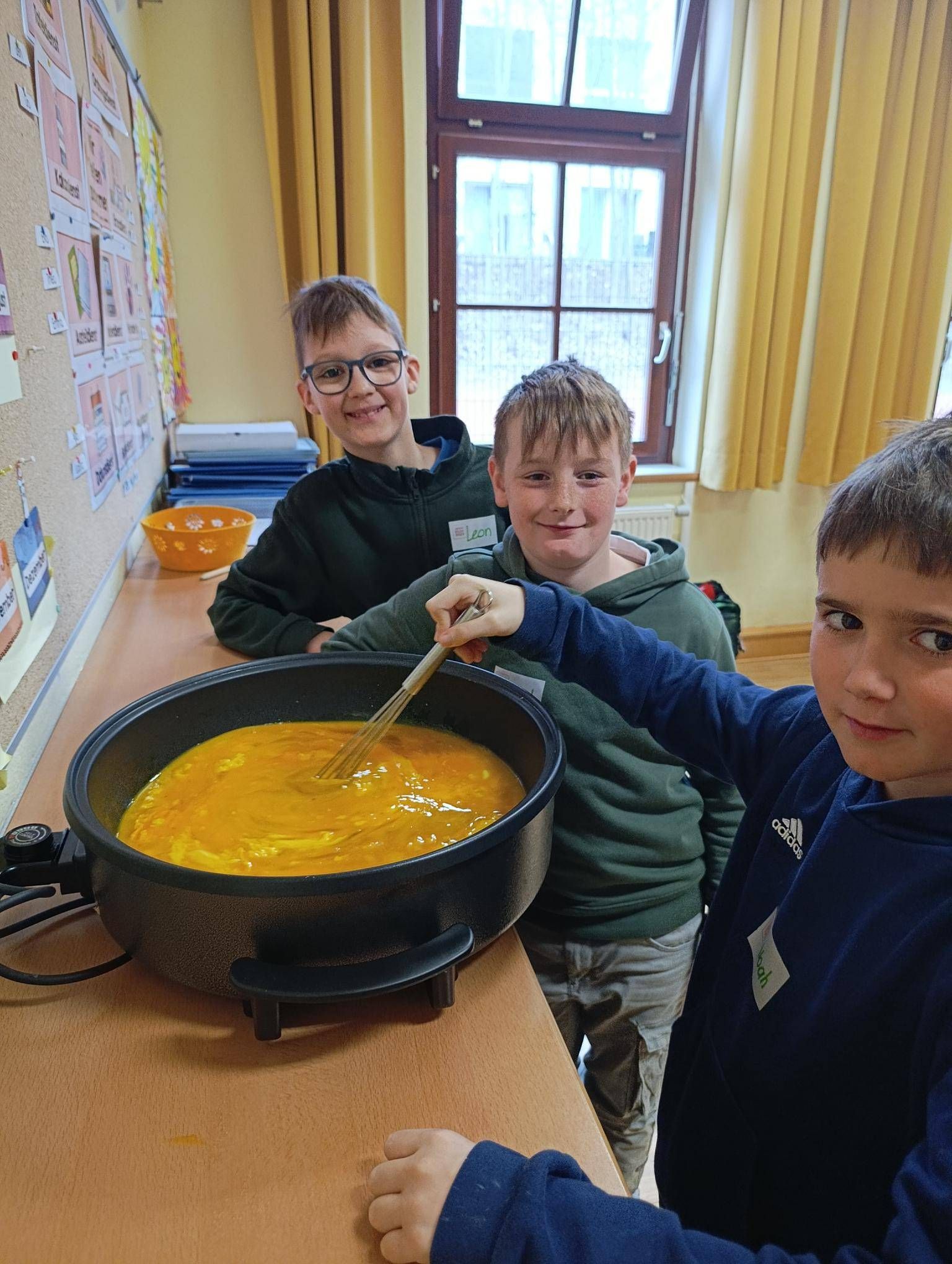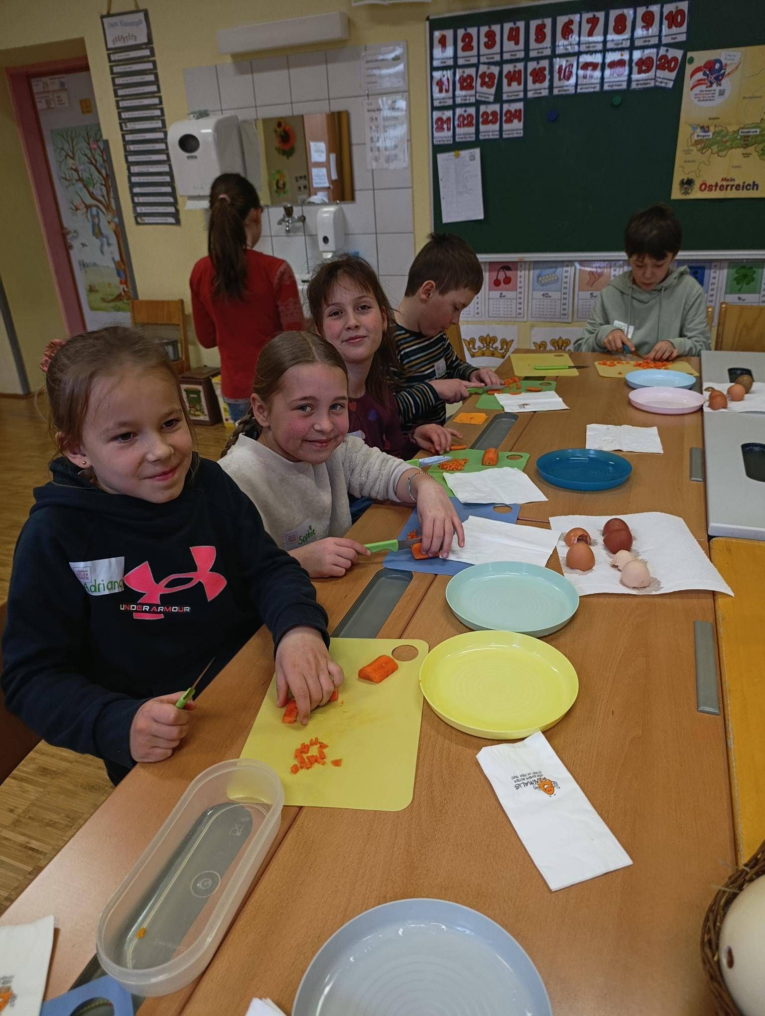 Die Kinder erfuhren dabei viel Wissenswertes über das Ei. Vom Aufbau des Eis, über die richtige Lagerung und Produktionsformen bis zu den verschiedenen Gütesiegeln und ihre Bedeutung erfuhren die Kinder viel Neues. Natürlich durften sie auch praktisch arbeiten. Gemeinsam wurden Experimente rund um das Ei gemacht. Ein Highlight war die Zubereitung einer Eierspeise, die im Anschluss mit Genuss verspeist wurde.