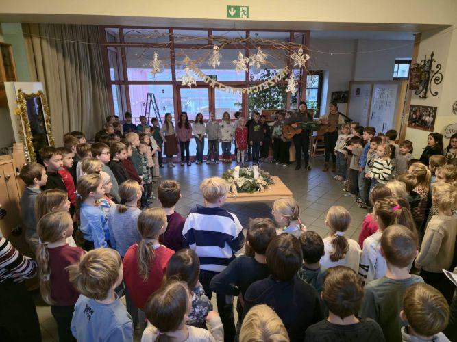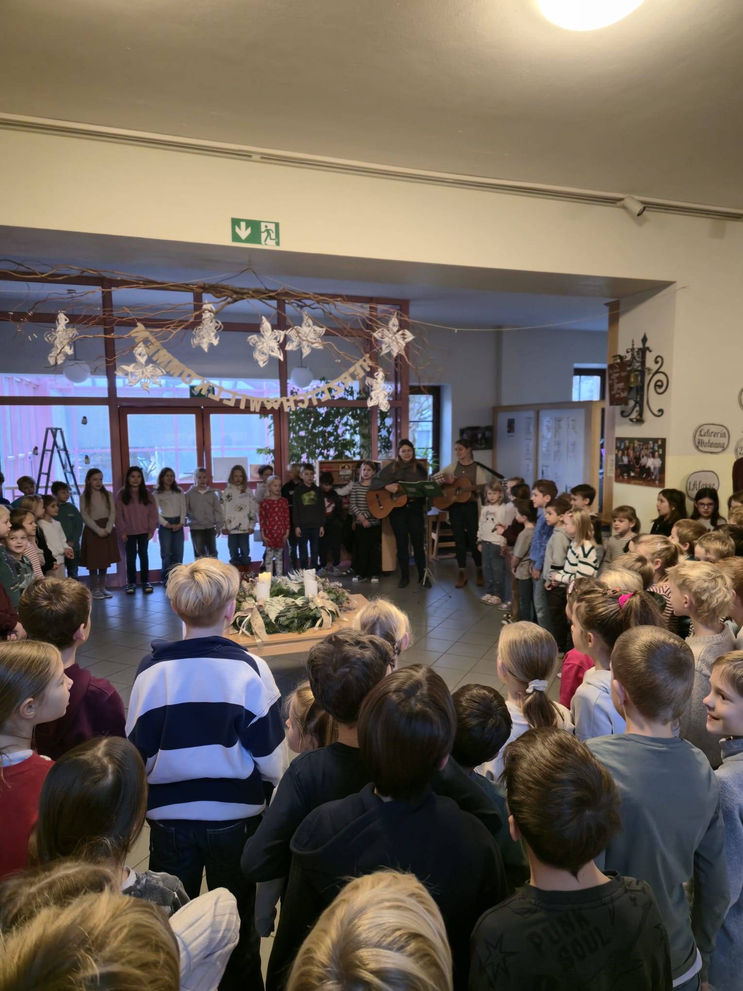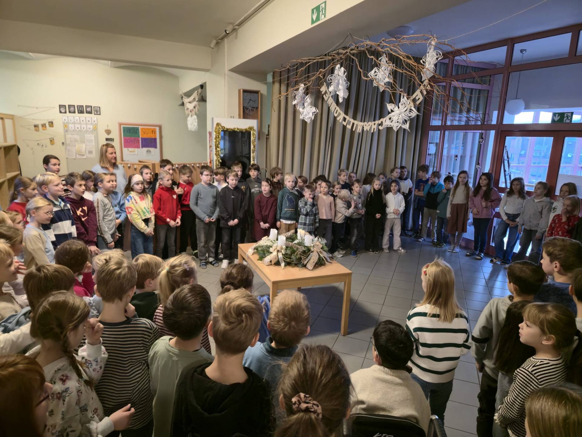 Die Adventszeit hat begonnen! Passend dazu leuchtete heute die 1. Kerze am Adventskranz der Schule. Gemeinsam wurde in der Aula gesungen und musiziert.
